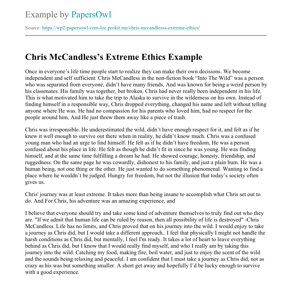 · Argument 1: Chris McCandless is very stubborn and arrogant. Chris McCandless fails to see reality and that is one of his tragic flaws this is what ultimately leads to his demise. Chris McCandless doesn’t accept help or advice when given to him. Jim Gallien a union electrician, whom gives Chris a ride to Denali National Park Chris McCandless states “The very basic core of a man’s living spirit is his passion for adventure. The joy of life comes from our encounters with new experiences, and hence there is no greater joy than to have an endlessly changing horizon, for each day to have a new and different sun.” We will write a unique paper on this topic for you! According to Chris McCandless hero essay, he hates having too much attention in public and doesn’t want to be noticed as a spoiled rich person. Chris McCandless is very self-reliable and hardworking and hates being spoiled by anyone which means he