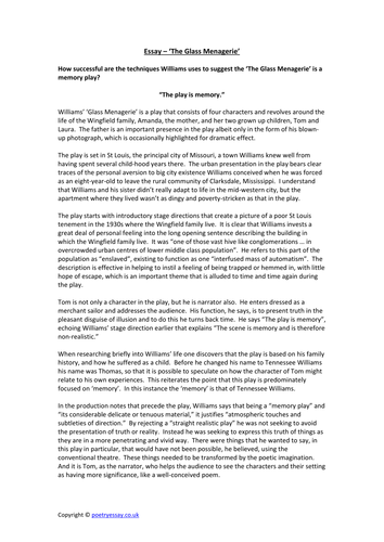 The glass Menageries is a modern play that written by Tennessee blogger.com play is called by another name which is “ Memory play “ because Williams uses a special technique that the play about a character’s memory. Right now ‘Williams gets from the mechanism of film.. Especially from silent film, to present the interrupted · We will write a custom Essay on The Glass Menagerie specifically for you for only $ $11/page certified writers online Learn More Amanda plays important role in Laura’s reticence and pathological shyness. While she cannot be blamed for making her shy in the first place, she is to blame for making Laura’s continued shyness The Glass Menagerie Essay “The Glass Menagerie” is set in the apartment of the Wingfield family. By description, it is a cramped, dingy place, not unlike a jail cell. It is one of many such apartments in the neighborhood. Of the Wingfield family members, none of them want to live there. Poverty is what traps them in their humble abode