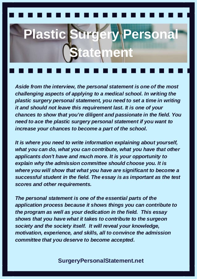 8 Techniques to Write the Best General Surgery Personal Statement Learn about the program: You must know a lot about the program you are applying to if you want to increase your chances Learn about the career: Not only knowing about the program will allow you to get more chances, but also Estimated Reading Time: 8 mins · Breast Surgery Fellowship Personal Statement Sample It isn’t easy to craft an interesting, error-free and enticing personal statement with HOME ESSAYS Trauma Surgery Personal Statement. Trauma Surgery Personal Statement Topics: Medicine, Physician, Patient, Health care, Medical school, Learning / Pages: 2 ( words) / Published: Feb 8th, Continue Reading The area of